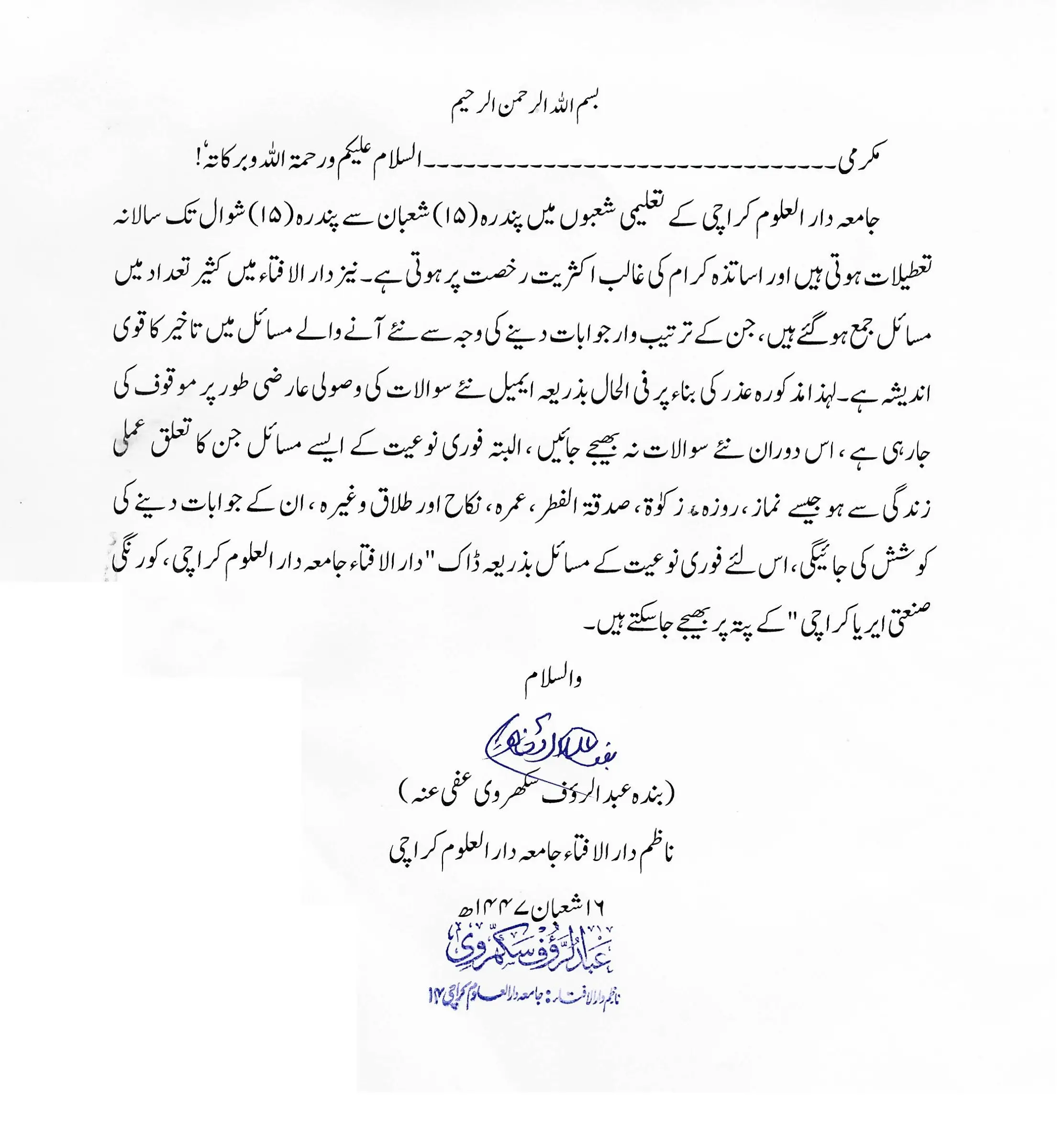 فقیہ ملت مفتی اعظم پاکستان حضرت مولانا مفتی محمد شفیع صاحب رحمۃ اﷲ علیہ (بانی جامعہ دارالعلوم کراچی) ایک کہنہ مشق فقیہ تھے، اﷲ تعالیٰ نے فتوے کے حوالے سے آپ کو بلند مقام عطا فرمایا تھا، پہلے دارالعلوم دیوبند (انڈیا) میں صدر مفتی کے اہم منصب پر فائز تھے پھر ۱۹۴۸ء میں ہندوستان سے ہجرت کر کے پاکستان تشریف لائے تو یہاں بھی مسلمان اپنے مسائل کے حل کے لئے بکثرت رجوع کرنے لگے اور حضرت مفتی صاحب رحمۃ اﷲ علیہ احکام شرعیہ سے انہیں آگاہ فرمانے لگے، اس طرح رفتہ رفتہ آپؒ کی ذات ایک چلتے پھرتے دارالافتاء کی حیثیت اختیار کرگئی، پھر عوام الناس کی سہولت کے لئے برنس روڈ کراچی کی مسجد ’’باب الاسلام‘‘ سے متصل ایک دارالافتاء قائم فرمایا، جہاں آپؒ نے سال سال تک فتوے کا کام کیا۔